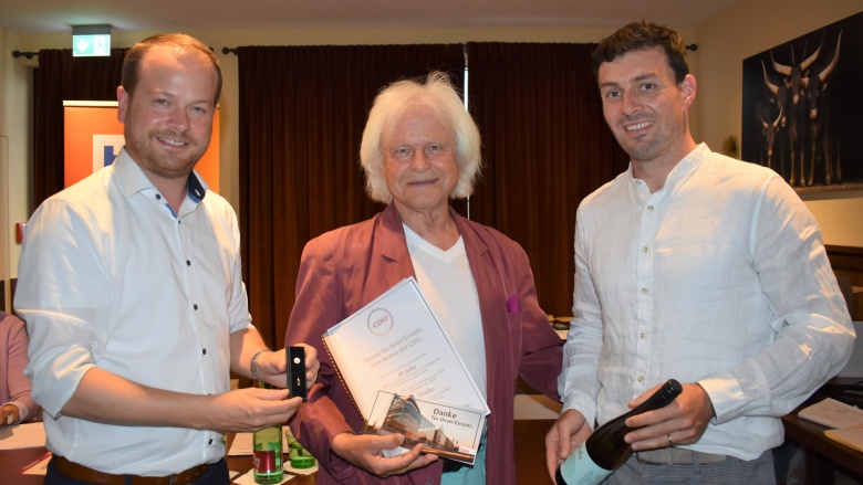 Neben den in die Zukunft gerichteten Vorstandswahlen eröffneten die Ehrungen für langjährige Mitgliedschaften den Blick auf vergangene Geschehnisse der Jahre 1983, 1973 und 1963. Für 60 Jahre Mitgliedschaft in der CDU verlieh der Kreisvorsitzende, Christian Natterer, im Namen der CDU- Parteivorsitzenden Friedrich Merz und Thomas Strobel dem Bürgermeister a.D. Fredo Endres, die Ehrennadel in Platin.